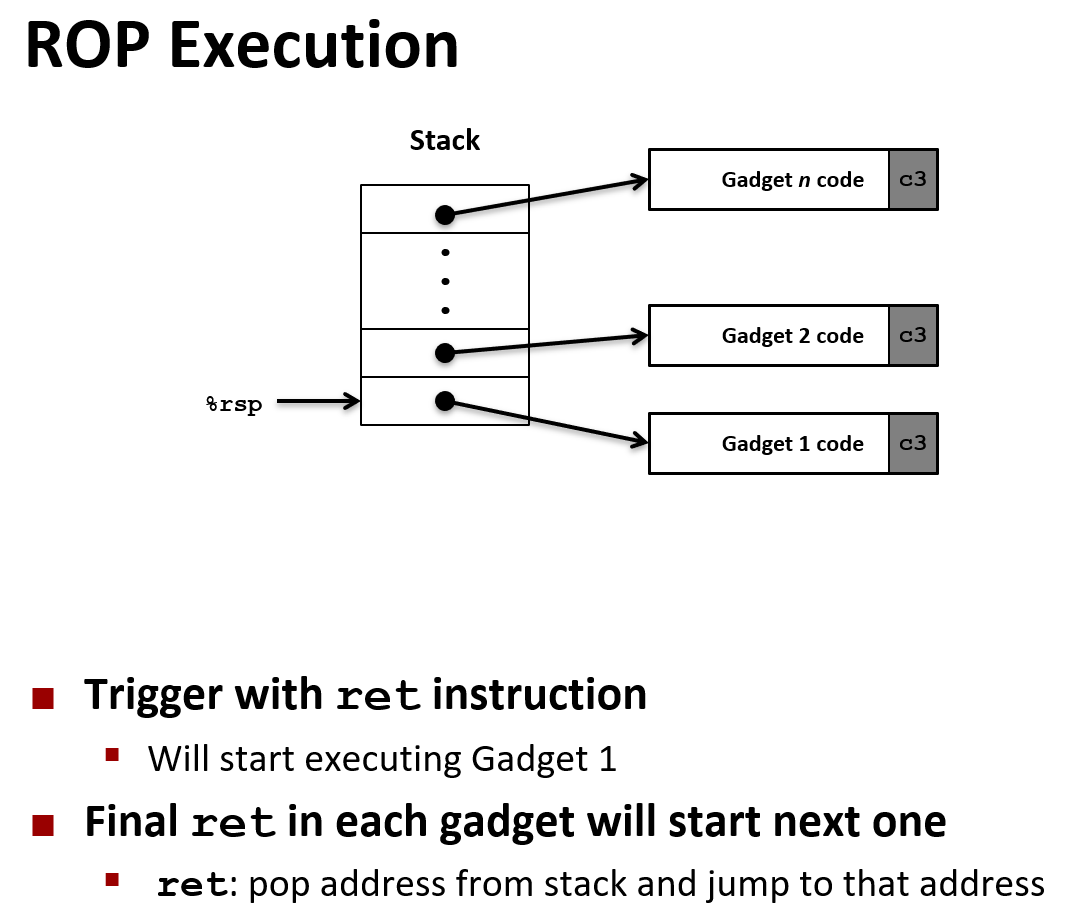 )。这就意味这我们可以收集这些 gadget 的地址,按照我们的需求依此排列这些 gadget,通过输入将这些地址溢出到栈里,让栈充当程序计数器的角色,反复执行 gadget1