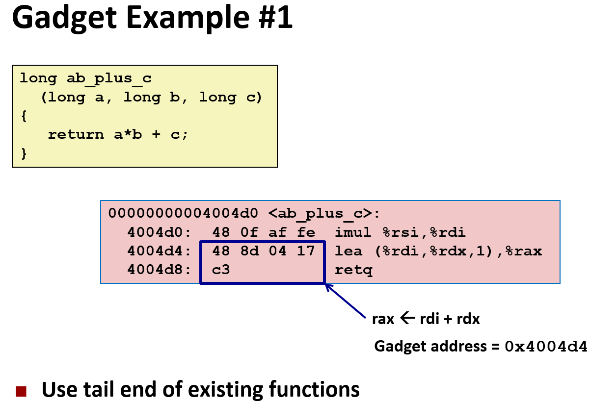 这种攻击利用的部件称之为 gadget,通常是各个函数的包含 ret