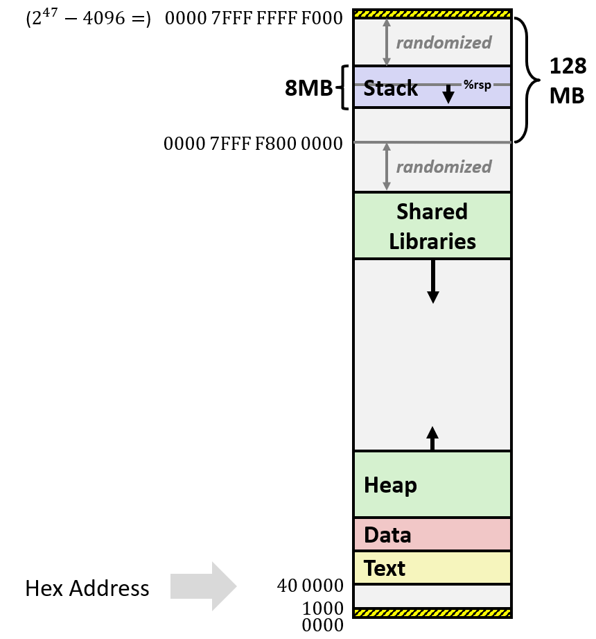 以上区域,text / data / shared libraries 区域运行时可读可执行,heap / stack 区域可读可写不可执行。