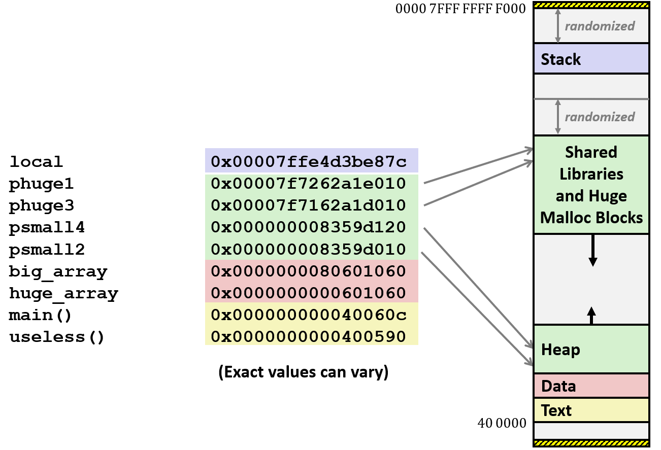 这些位置都由 virtual memory allocator 进行管理,如果访问了超出整个内存的范围,或是不在已分配的空间内,系统都会抛出 segmentation fault;