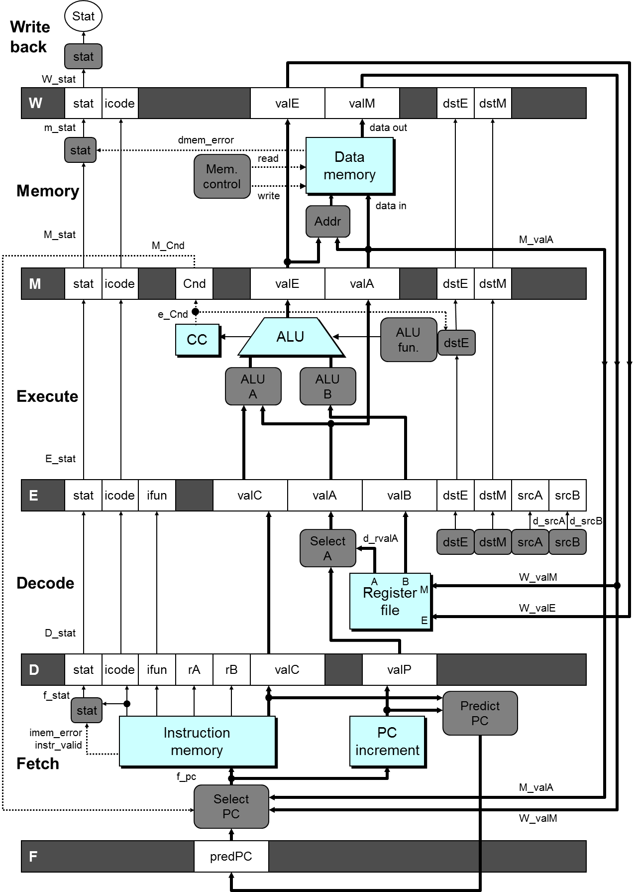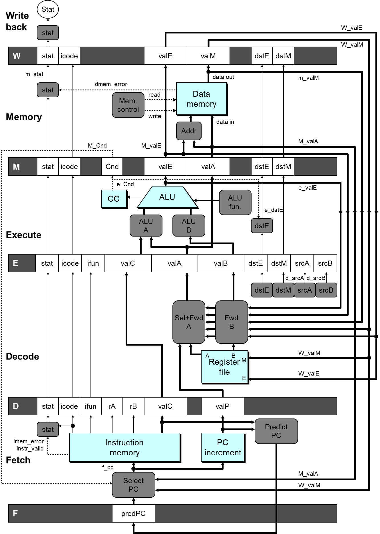 我们将前几节的 Pipeline 设计的思想和注意要点结合起来,考虑设计一个 Y86-64 pipeline 处理器的最终版本。