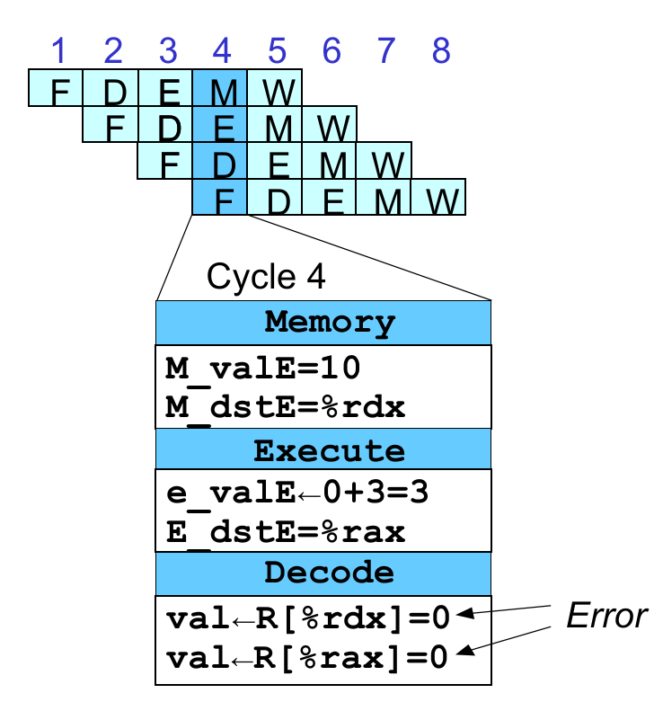 你可能会想,我们要模仿 SEQ,先检测到错误没事,只要我们在这条指令完全结束后(该指令到 Write Back Stage 结束)再报出错误,就能避免上面两种情况的发生。但这样做可能引发另一类问题: