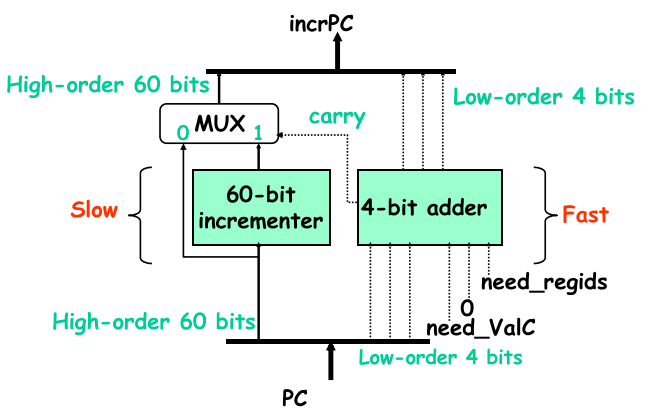 我们发现 increment 阶段是关键路径上较大的部分,它要等待 regids、valC 结果,然后执行 64-bits 的加法运算(最多 +10),所以我们可以先将前 60 bits 的数据 +1(同时保留不加、+1 的数据),然后另一部分仅仅是 4 bits 数的相加,这样可以节省串行进位加法所耗费的时间,如下图所示: