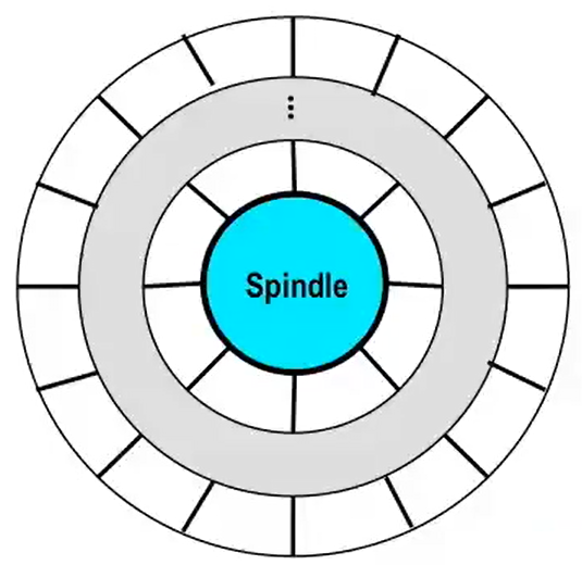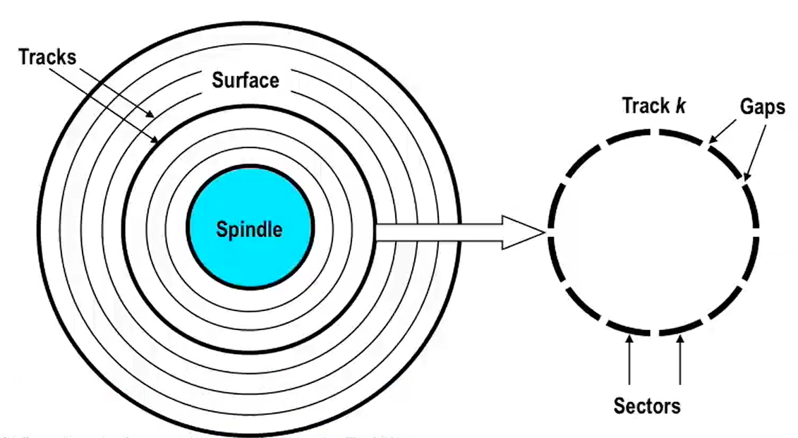 硬盘中包含一系列盘片(platter),每个盘片有两个面,每个面上涂有磁性材料,并且存在一圈圈同心圆(concentric rings),被称为 磁道(tracks),每个磁道包含若干 扇区(sectors),扇区之间会有空隙间隔(gaps),一个扇区通常的大小是 512 bytes;