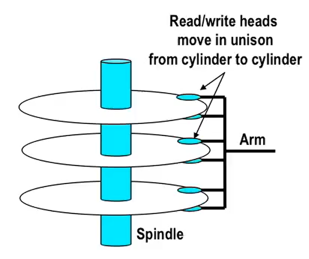 盘片轴(spindle)连接一系列盘片,每个盘片相同位置对齐的磁道称为 Aligned tracks,在垂直方向组成一个圆柱,这个相同位置的磁道所组成的元素称为 柱面,数据按照不同柱面进行存储,同一柱面的数据连续(为啥按柱面存?因为方便机械臂访问)。