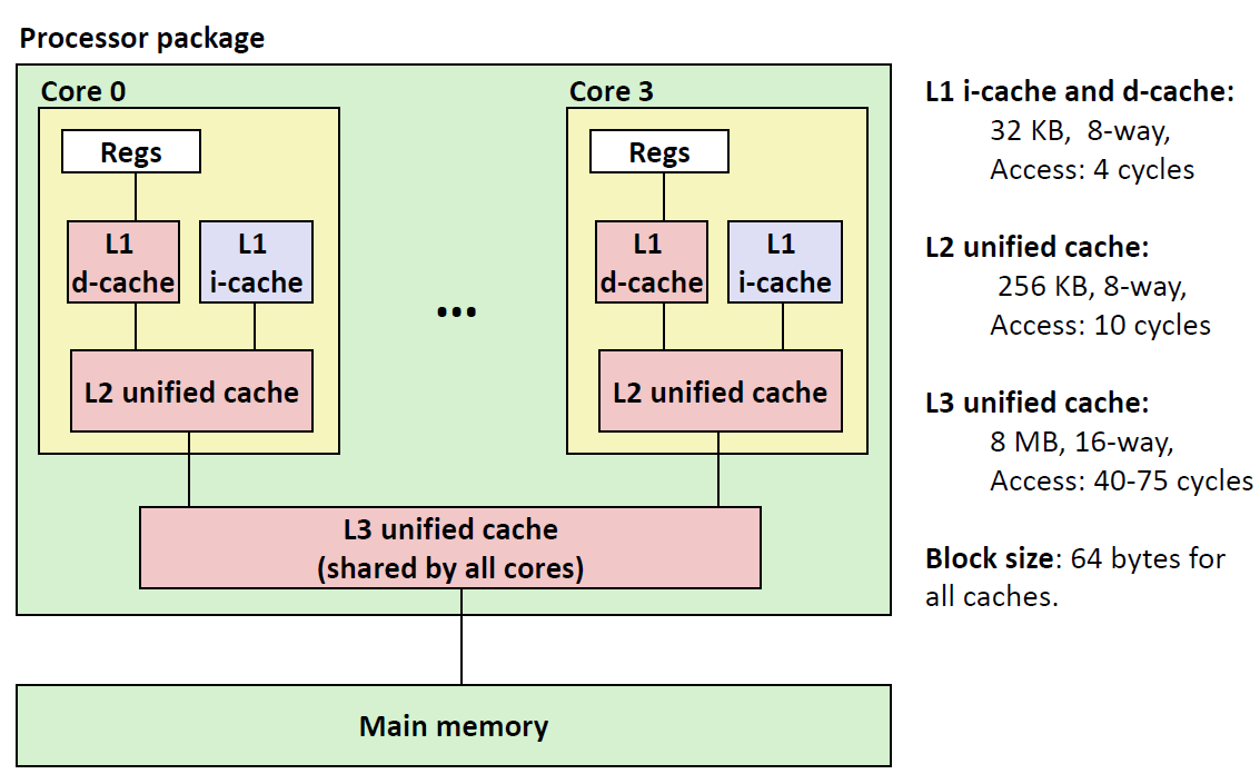 大家不难发现,寄存器离 CPU 很近,所以访问速度很快,通常在 3 个时钟周期左右就能读写到值。但是内存(图中 Memory Devices 芯片组)离 CPU 相当远,中间的步骤相当多,所以对内存读写所消耗的时间大约是对寄存器读写耗时的 100 倍左右。这就是计算机内存系统引入所发现的其中一个性能损耗。