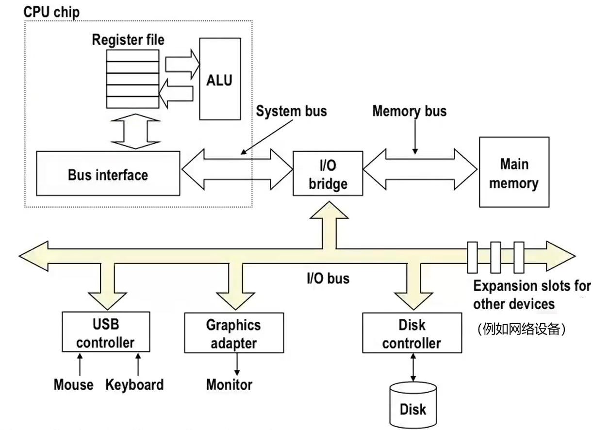 上面的图仅仅是比较简单粗略的抽象,不要较真。在比较老的计算机架构中(因为现代系统有专有的总线设计,非常复杂),采用 总线(bus)来连接 CPU 和主存的,数据通过总线在主存和 CPU 间来回传输。并且总线通常与其他多种设备共享。