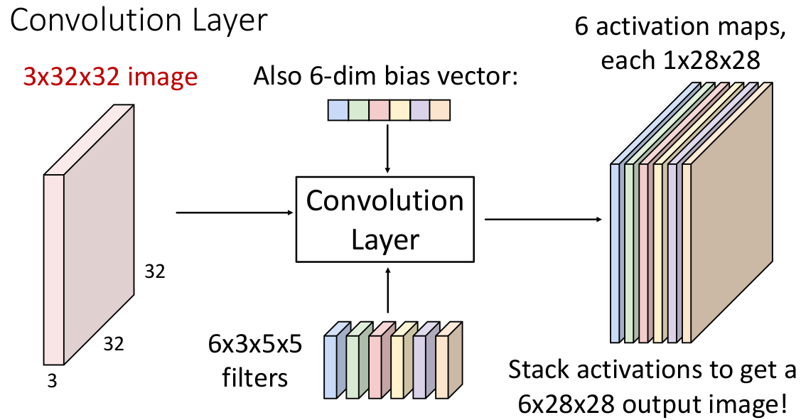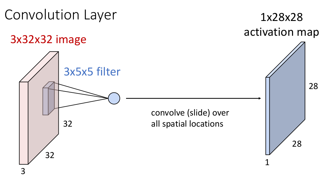 考虑为了应对存在空间结构的输入,引入一个新的卷积计算方法:假设输入是一个 3 x 32 x 32 图像张量(深度为 3),引入 3 x 5 x 5 的 filter(之前的 weight matrix),并暂时假设 filter 的深度与输入图像的深度相同。