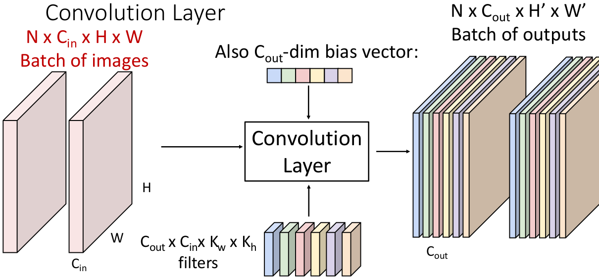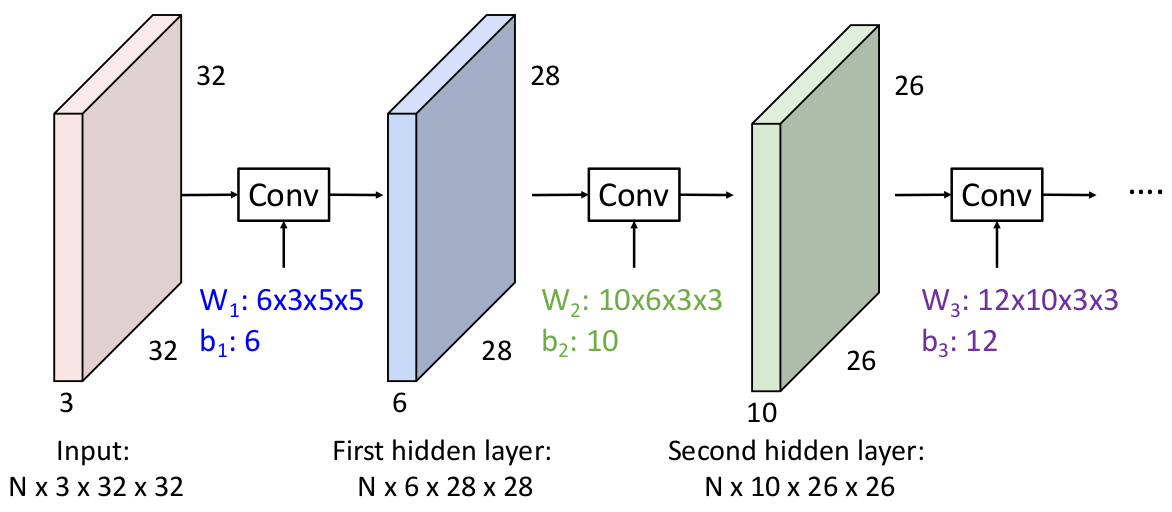 实际上在应用中我们会批量处理输入张量,假设每批 2 个,那么输入张量就能组成 4 维张量(2 x 3 x 32 x 32)。