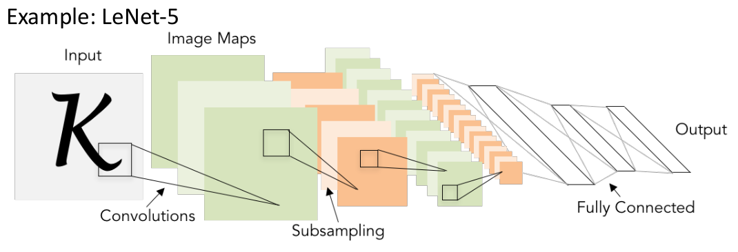 一种比较经典的网络设计方式是,使用 (卷积层 + ReLU 激活函数 + 池化层) * N -> flatten -> (线性全连接层 + ReLU 激活函数) * M -> 线性全连接层 (输出 scores)。例如 LeNet-5 网络: