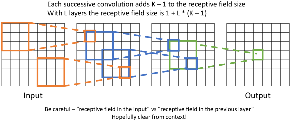input tensor 中针对某个特定 activation 的有效的感受区大小,会随着卷积层的堆叠 线性增长。