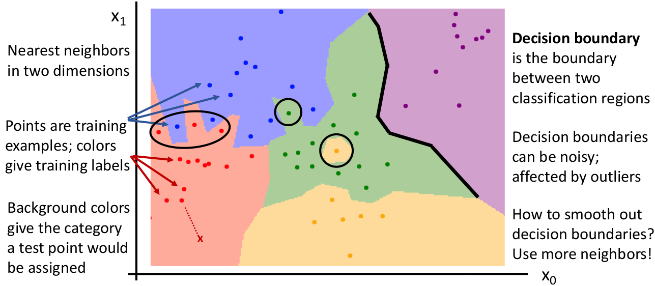 我们引入 decision boundaries(决策边界)来描述,这幅图被称为 Voronoi Tessellation(维诺图,沃罗诺伊分割):