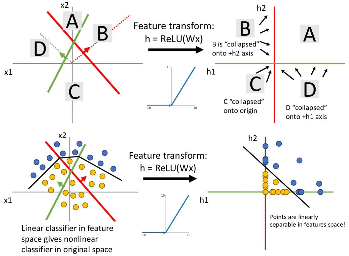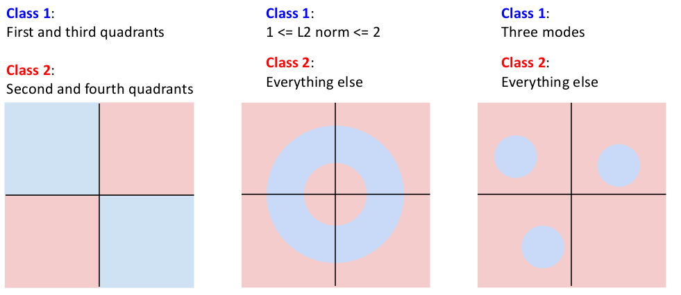 对于一个二维数据(例如 2 个像素的图像),点代表训练集,颜色代表标注的 labels。没有标注点的是其他的可能数据。而黑线就是按照模型算法判断的决策边界。所谓区分两个类型就是确定两个类的决策边界(黑线)。下次测试输入数据时查看落在哪块区域内即可。