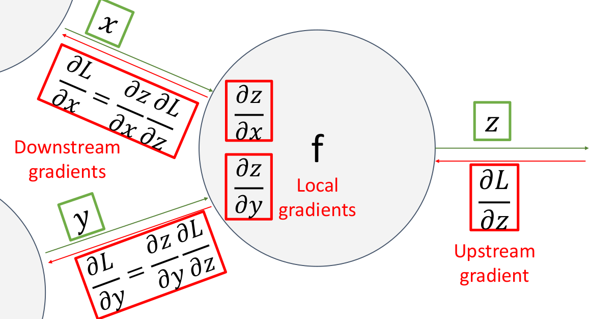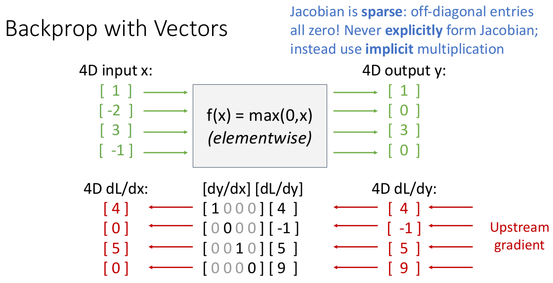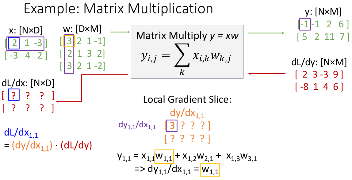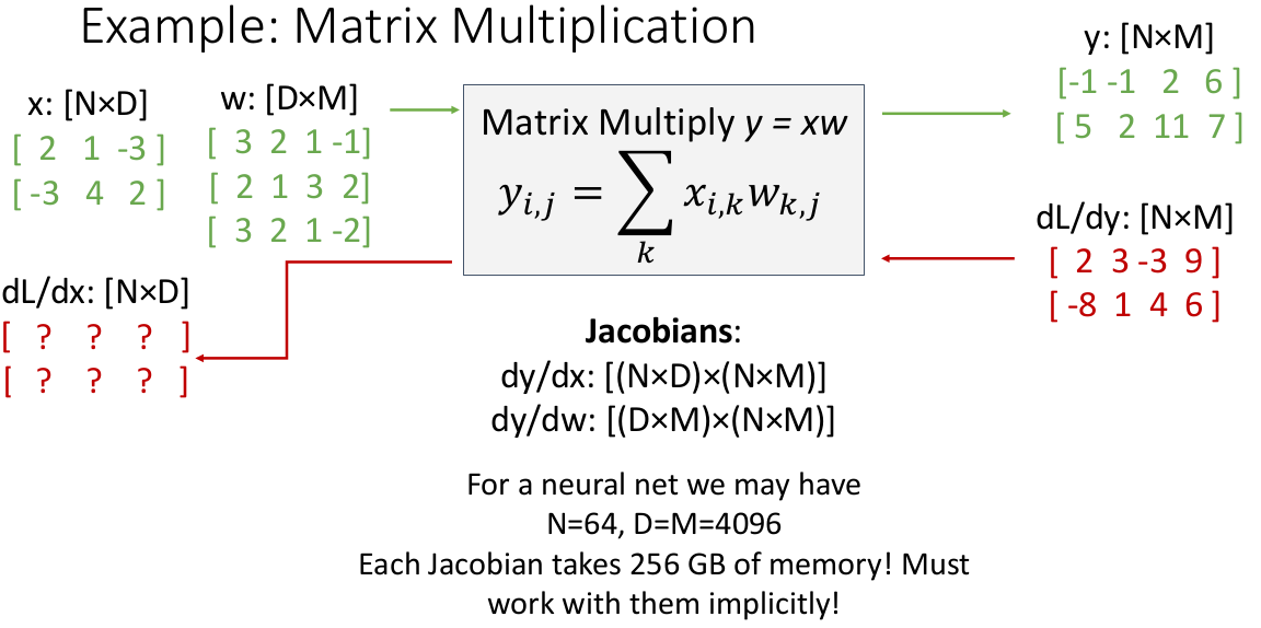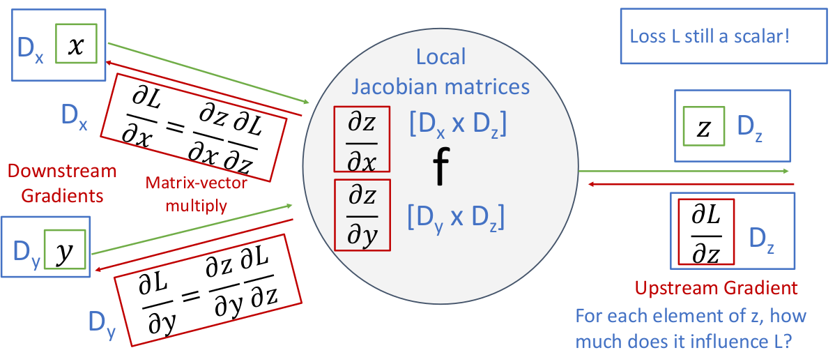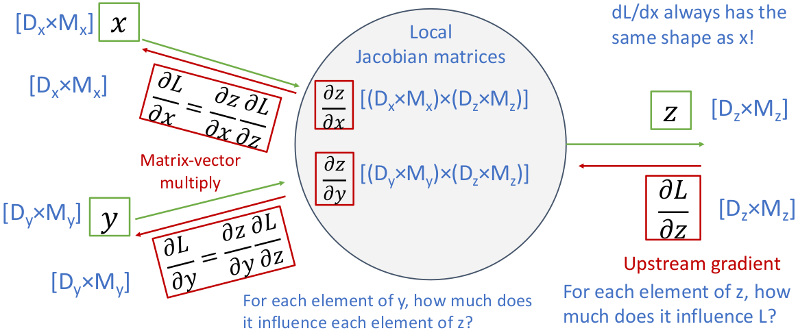 通过链式法则,我们有广义上的 “矩阵-向量乘法”(即高维张量和二维矩阵的乘法),同样可以得到 downstream gradients。