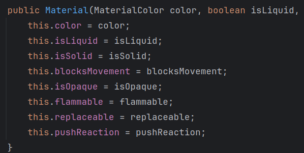 一个方块材料主要描述了方块的颜色、是否为流体(流体涉及的渲染和运动逻辑在后面介绍)、是否可以着火、被活塞等实体推动后的行为,等等。