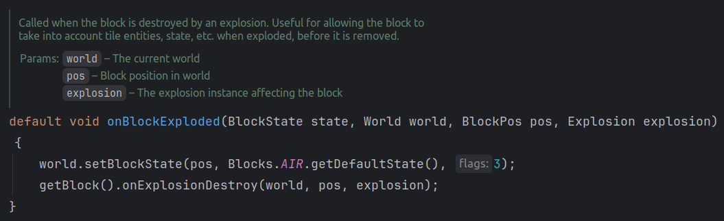 注意到虚函数的默认实现是:当方块被爆炸波及后,先将方块设置为 “和空气的默认方块状态一样” 的状态(等价于破坏了当前方块),然后调用 Block