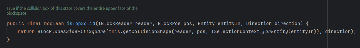 检查指定方块的指定方向的 碰撞箱 是否覆盖该方块表面。关于方块的碰撞箱的定义,我们将在 “模型” 一节继续讨论; -