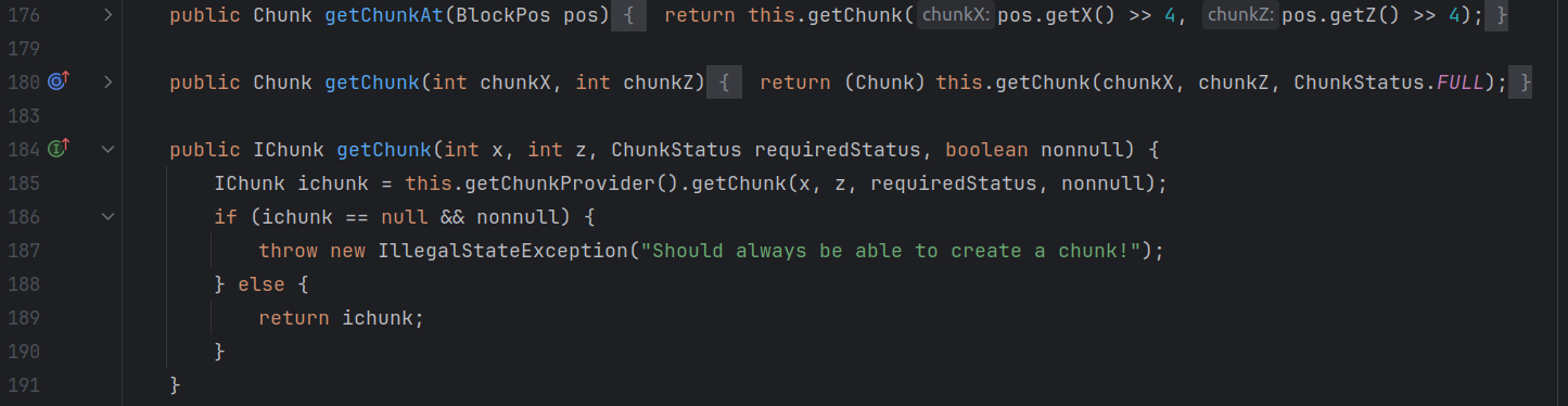 :按参数信息获取指定区块。其中有一个有趣的重载函数,能告诉我们 Minecraft 的区块划分方法: -