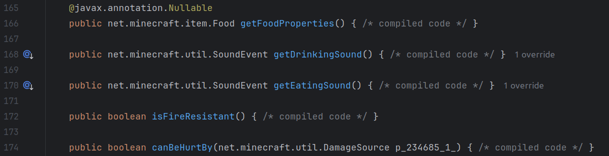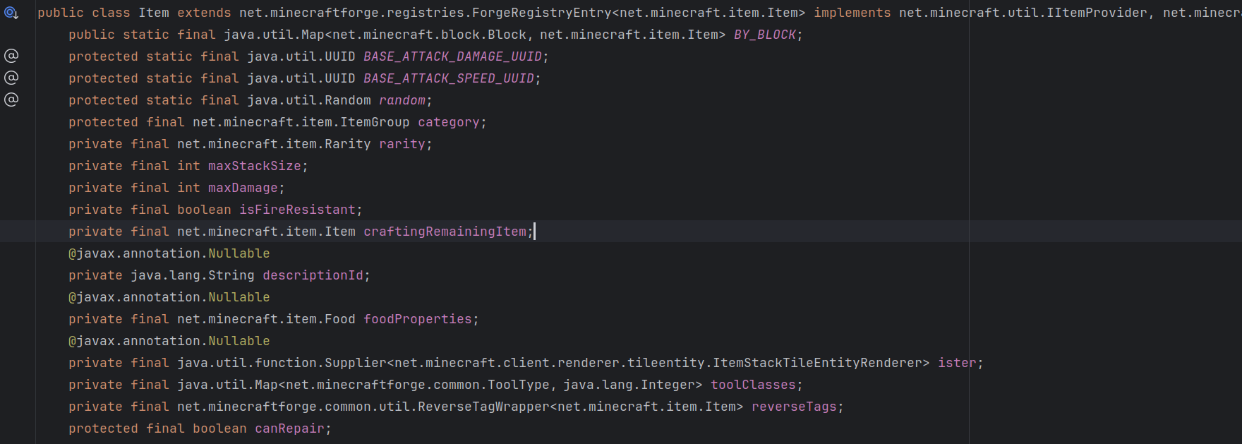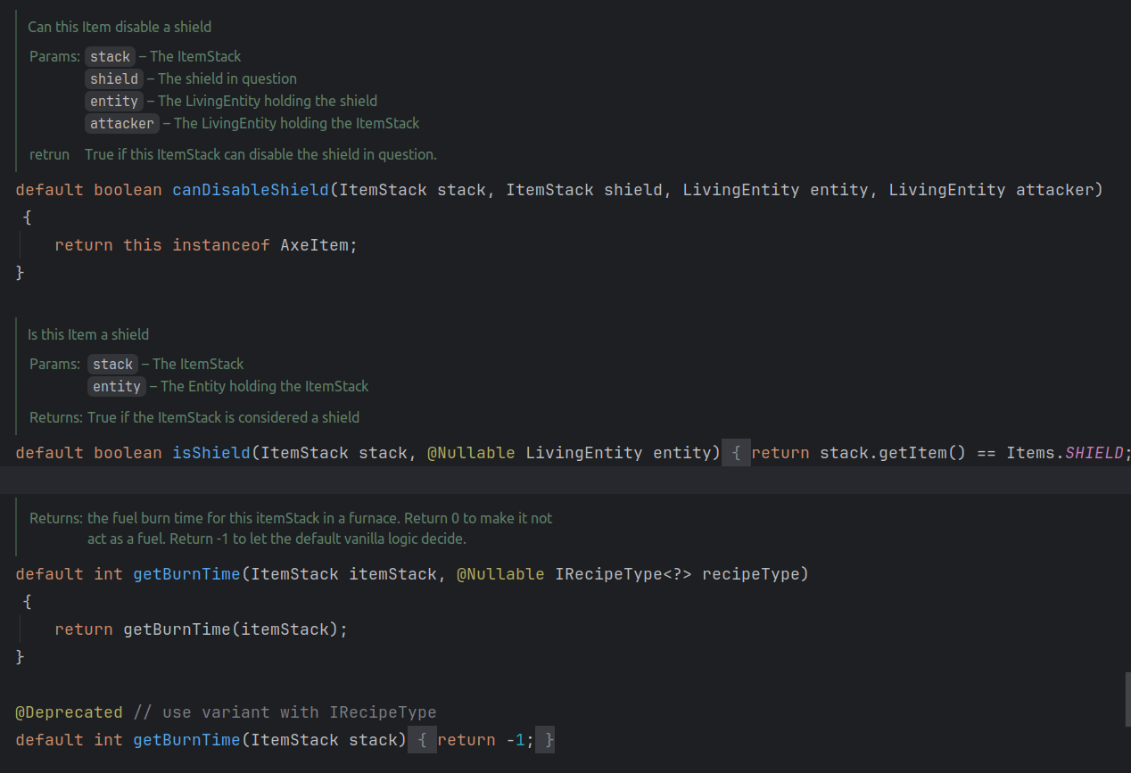 之类的方法,可以让我们定义一些类似盾牌特性的物品。更多有意思的方法请参见反汇编的 Java 代码(Forge 源码)。