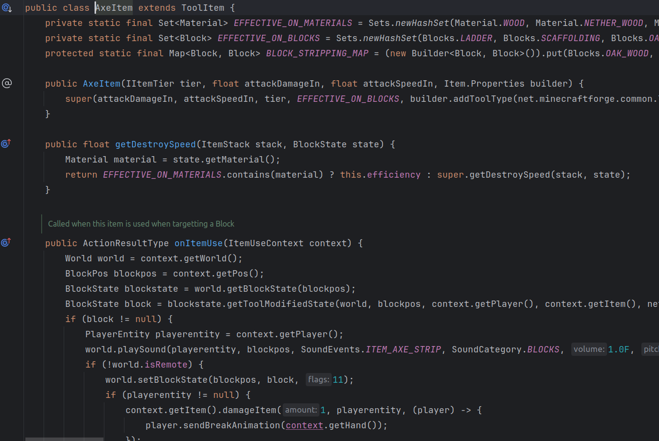 的实现类,因为它还有一些方法没有实现(因为逻辑上不需要)。为了了解更丰富的实现,我们再看看斧头 AxeItem