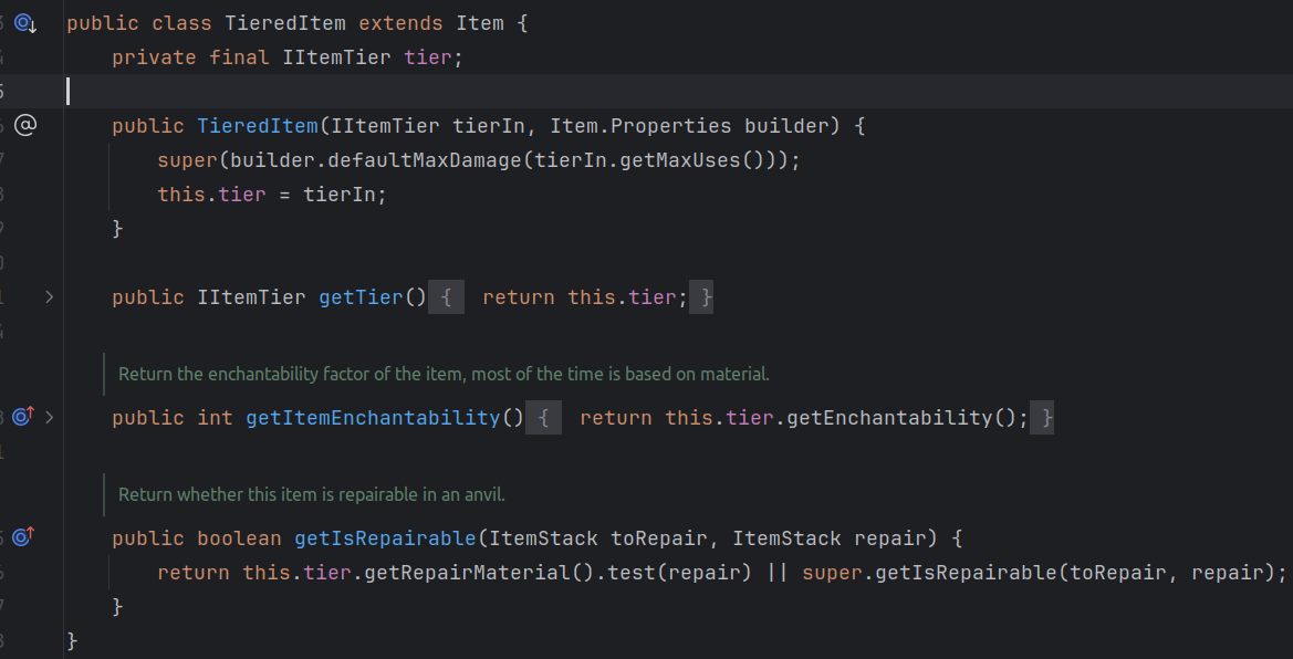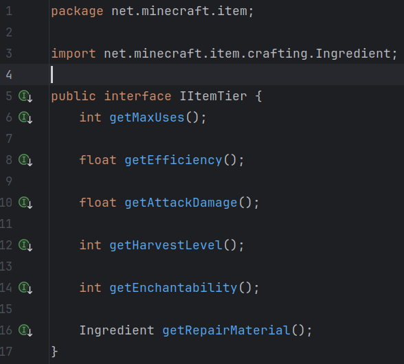 首先,细心的同学可以发现,木头、石头、铁、黄金和钻石种类的武器面板基础数据(除去附魔等加成的效率、耐久、伤害……)是不同的,并且损坏后修复的材料不同。但它们都是 “剑 / 稿 / 斧 / 锄 / 铲” 这个属性,所以这些额外的数据可以抽象为一个单独的类 / 枚举类型来管理,在初始化时再传给 “剑 / 稿 / 斧 / 锄 / 铲” 这个类。在 MC 中,它就是接口类型 IItemTier