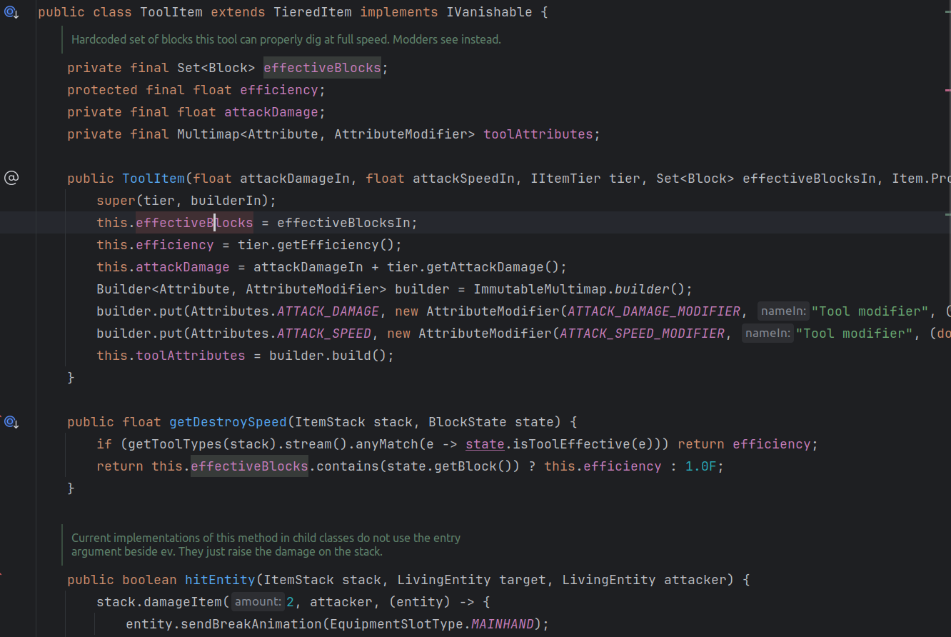 的集合类型,表示该工具对哪些方块起特殊效果。并且只有遇到起效果的方块,该工具的 destroySpeed