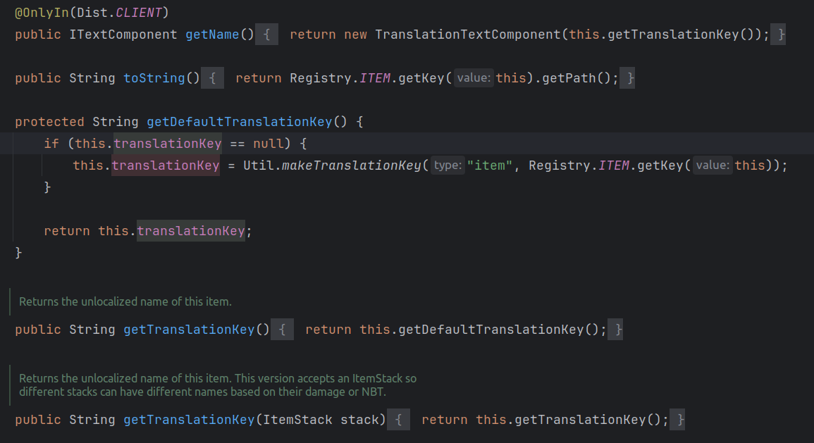 可以看出翻译的方法是:获取名称时就使用 TranslationTextComponent